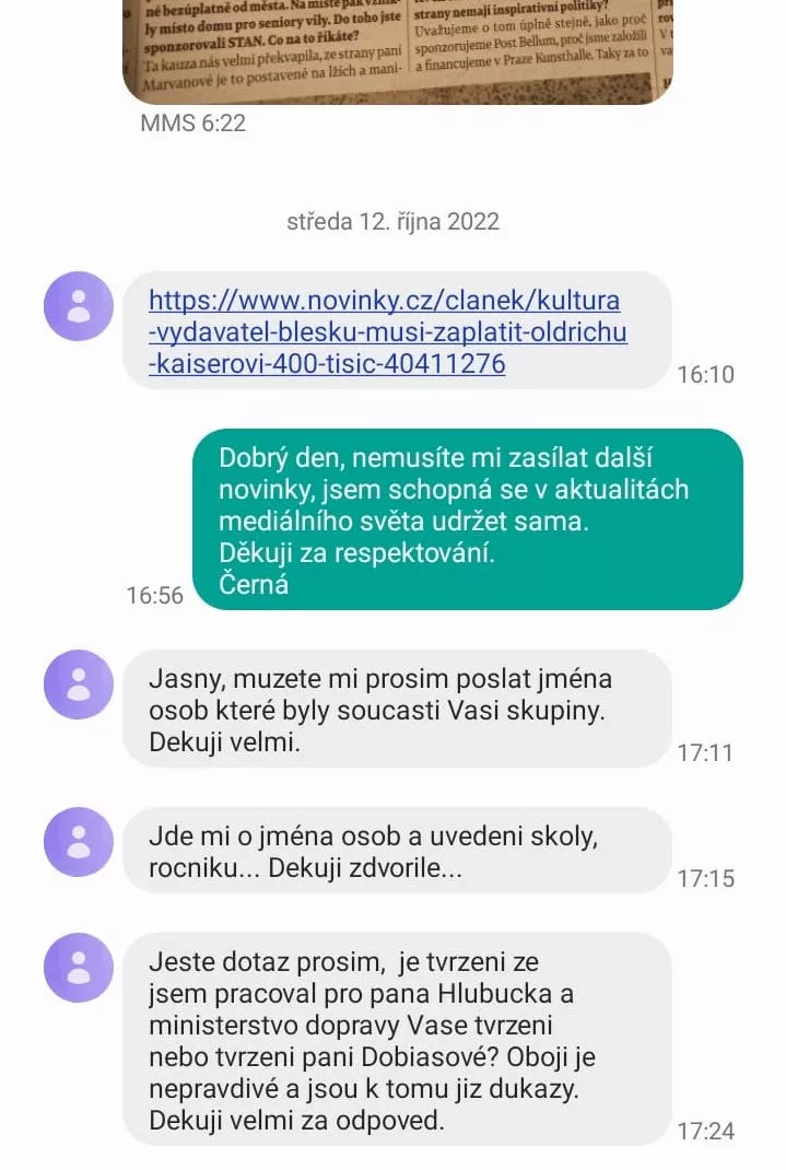 Stejný večer obdržela jedna z členek (A. Č.) našeho týmu podobně obviňující SMS zprávy od advokáta Gabriela Achoura. Týkaly se naší další kolegyně z týmu V. D.: „Byl jsem konfrontován se skutečností, že paní Dušková se údajně vydávala za spolupracovnici týdeníku Reflex. (…) Něco tu nesedí. (…) Reflex se od ní údajně distancuje, a to slovy pana šéfredaktora Stoniše.”